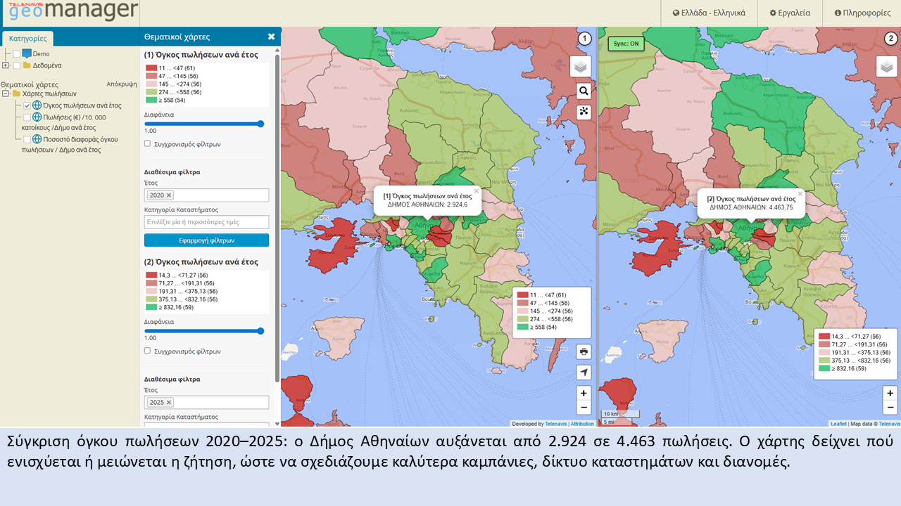 Μέσα από δυναμικούς θεματικούς χάρτες και dashboards, η ομάδα μας παρακολουθεί με ακρίβεια τις πωλήσεις ανά κατηγορία προϊόντος, ανά είδος και ανά κανάλι διανομής. Έτσι διαθέτουμε πλέον μια πλήρη και ενιαία πανελλαδική εικόνα για την ευρωστία του εμπορικού δικτύου.