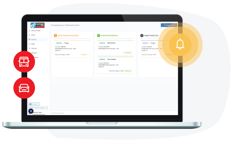 Το ERP Οχημάτων συγκεντρώνει όλα τα δεδομένα της εταιρείας σας σε ένα ενιαίο, εύχρηστο περιβάλλον. Παρακολουθήστε έξοδα, εργασίες, οδηγούς και έγγραφα με απόλυτη ακρίβεια και διαφάνεια. Οργανώστε προγραμματισμένες συντηρήσεις, ειδοποιήσεις και ανανεώσεις χωρίς καθυστερήσεις. Μέσα από έξυπνα γραφήματα και στατιστικά, αποκτήστε πλήρη εικόνα κόστους και απόδοσης στόλου.